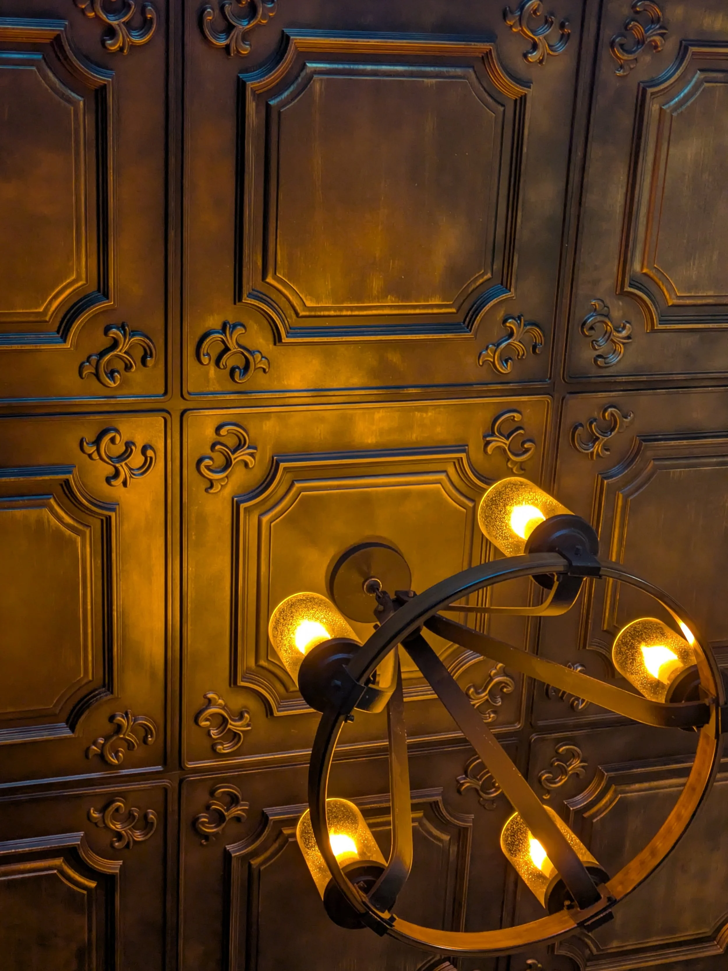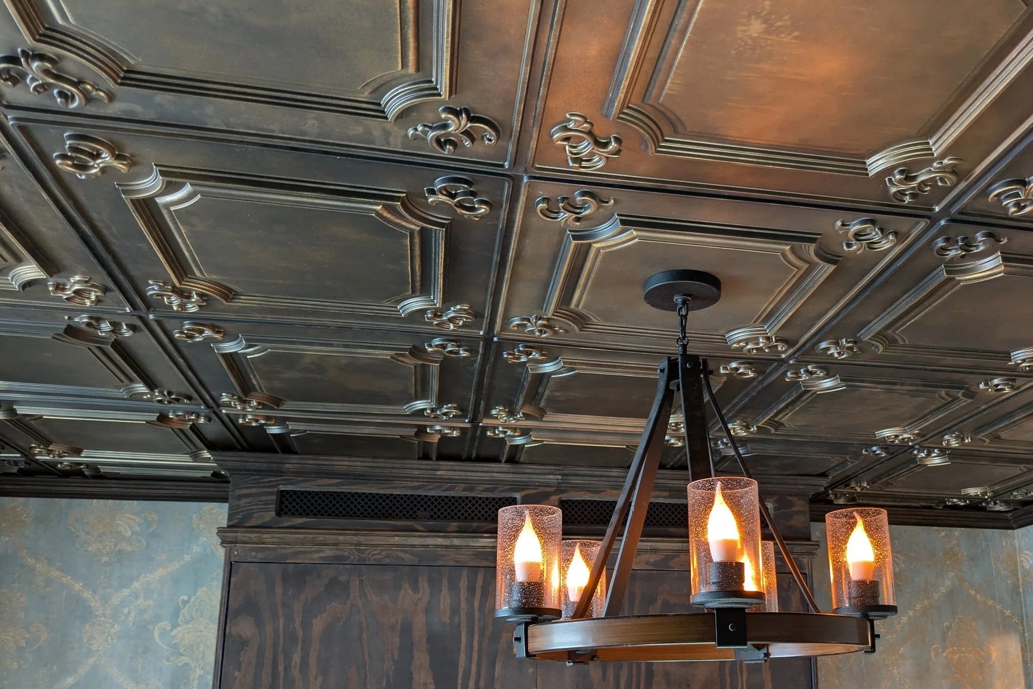 Plywood, Custom Millwork, Wallpaper application, Painted Wood Faux Finish, Faux Bronze Finish Ceiling Tiles and Light fixtures
